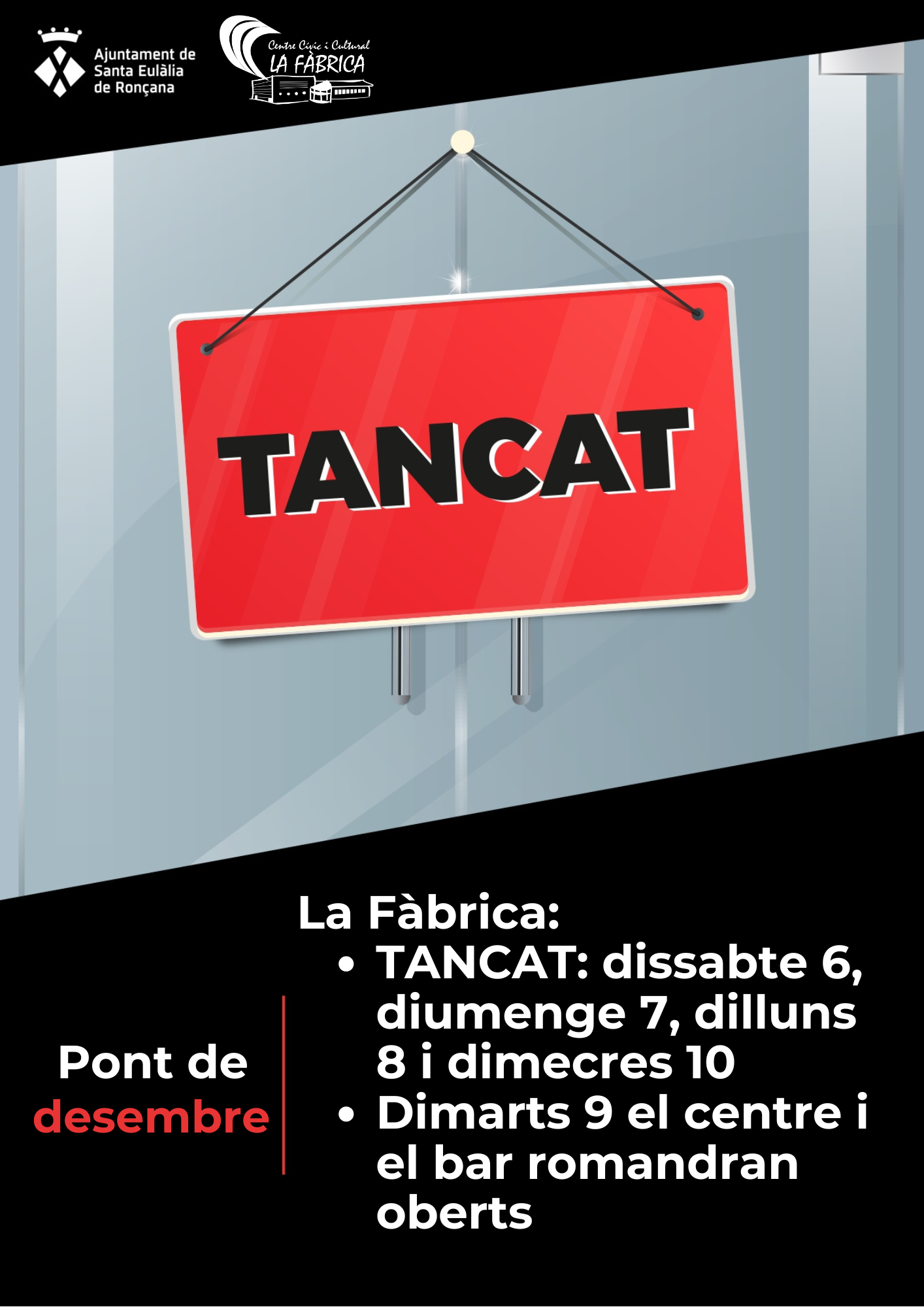 El Centre Cívic i Cultural La Fàbrica romandrà tancat dissabte 6, diumenge 7 i dilluns 8 de desembre.